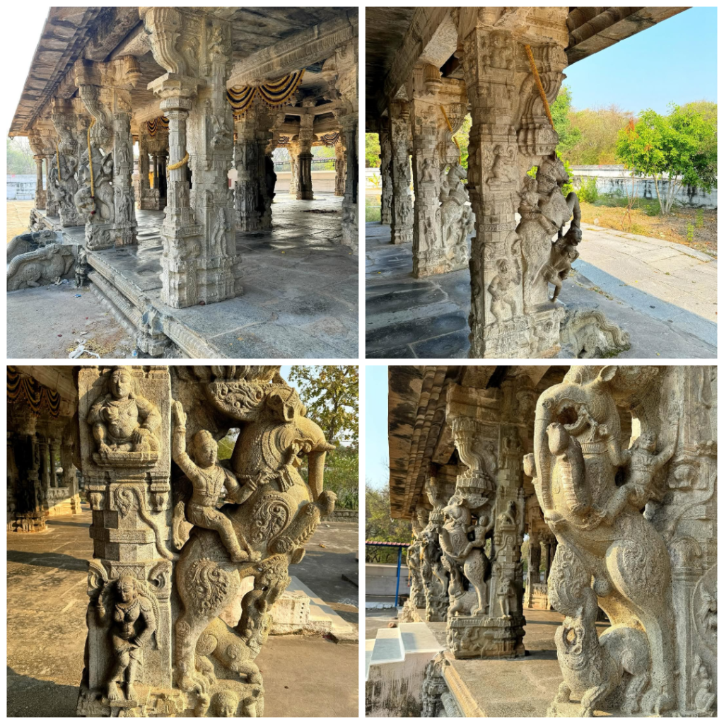 தானியக் கிடங்குகள், யானைகள் மற்றும் குதிரைகளுக்கான தொழுவங்கள், பீரங்கிகள், இளவரசர்களுக்கான குளியல் பகுதி கோயிலுக்கு ஒரு குளம், கோயிலுக்கு ஒரு கிணறு, அரண்மனை மண்டபம் மற்றும் பலவற்றை உள்ளடக்கிய சில பாழடைந்த வரலாற்று கட்டிடங்கள் உள்ளன. அடிக்கும் போது இசைக் குறிப்புகளை உருவாக்கும் வகையில் செதுக்கப்பட்ட தூண்கள். இங்குள்ள தூண்கள் ஸ்ருதி கண லய வகைகளின் கலவையாகும் என்று தமிழ் கவிஞர் கூறுகிறார். மண்டபத்தில் விஷ்ணுவின் பல்வேறு வடிவங்களின் அழகிய கட்டிடக்கலை பிரதிநிதித்துவங்களும், ராமாயணம், மகாபாரதம் மற்றும் ஸ்ரீமத் பாகவதத்தின் சில காட்சிகளும் உள்ளன. பல வைணவ கோயில்களைப் போலவே, கோயிலின் உள் மண்டபத்தில் ஆழ்வார்கள் மற்றும் வைணவ ஆச்சாரியர்கள், விஷ்வக்சேனர் ஆகியோரின் சிலைகள் வரிசையாக வைக்கப்பட்டுள்ளன. உள் மண்டபத்தில் விஷ்ணு மற்றும் அவரது அவதாரங்களின் சிற்பங்களுடன் நான்கு தூண்கள் உள்ளன. கோயிலில் இருந்து தொலைவில் ஒரு கோயில் தொட்டியும் உள்ளது.